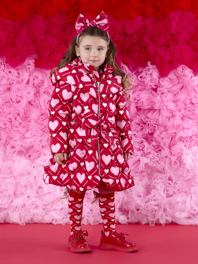 Baby girl's button up shearling coat from Mayoral, in red with a faux fur collar and two front pockets. It also features a gold logo badge at the h...
