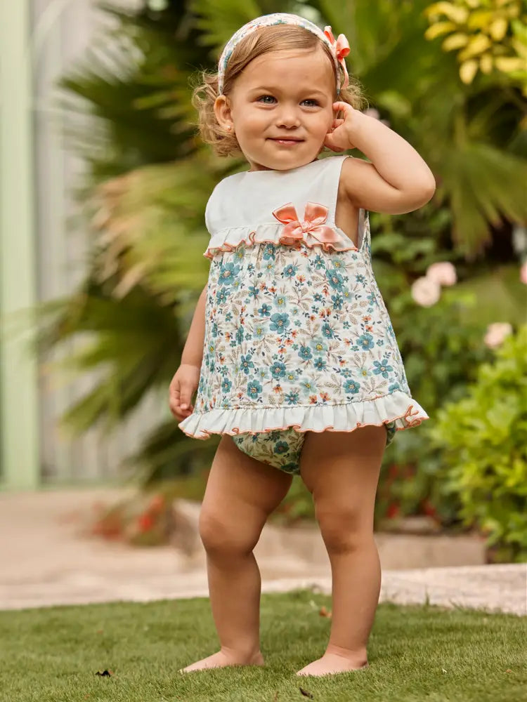 This coordinated outfit by Caramelo includes a soft pink lace trimmed top, with a sweet bow and ruffled lace trim across the middle. Also included ...