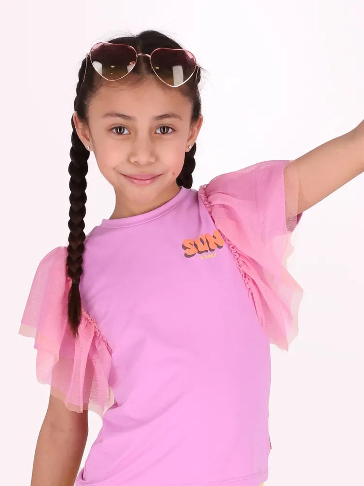 Caramelo girl's bright white, short sleeve dress featuring a lilac and green tulle frilled skirt, matching tulle sleeves, and a graphic print on th...