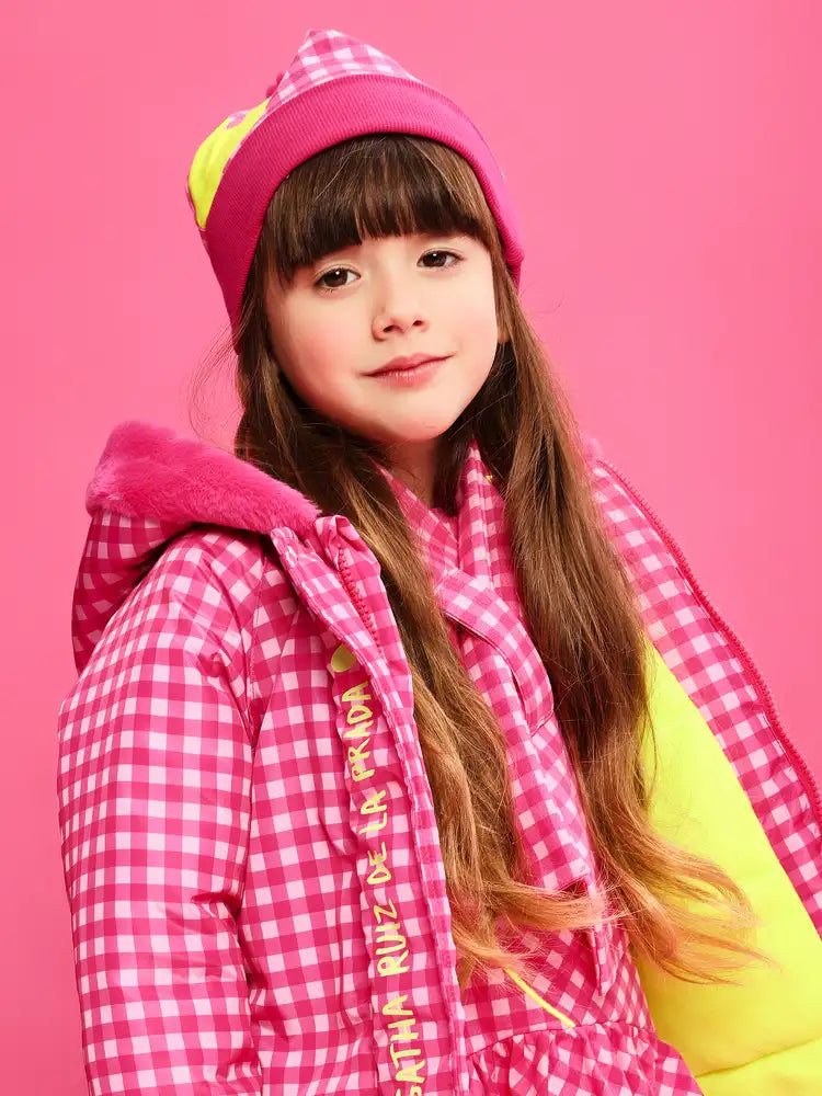 Guess girl's cosy winter hat, in jet black with two large faux fur poms, and an embroidered Guess logo on the front. Code: j3bz04