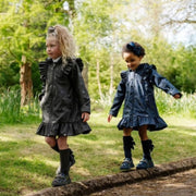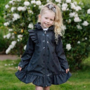 This charming raincoat by A Dee comes in plain black and features frilled trim at the shoulders, hem, and pockets. It also has frills around the hood, and is dotted with cute shiny hearts.