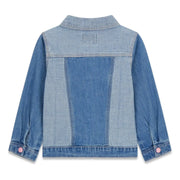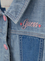Girl's stylish denim jacket by Guess, featuring an eye catching colourblock design in light and mid blue. It also has pink button fasteners, and a pink embroidered logo on the chest.