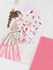 Girl's t-shirt and leggings set from Mayoral, includes a white t-shirt, and a pair of full length pink leggings. The t-shirt has capped sleeves and also features a flower girl print on the front.