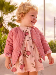 Baby girl's lightweight reversible jacket from Mayoral. Great for the unpredictable spring weather, this versatile jacket has a dusty pink side with curved pattern stitching, and a pale pink side with an all over pattern of pink cherries.