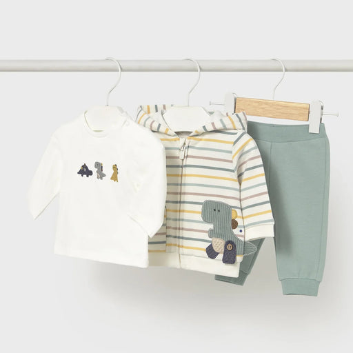 Mayoral newborn boy's tracksuit, includes a pair of duck egg blue track bottoms, and a white sweatshirt patterned with small dinosaurs. Code: 2620