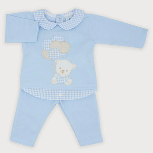 Sardon baby boy's two piece tracksuit, includes a pair of sky blue bottoms, and a matching blue top with a gingham collar, and gingham trim along t...