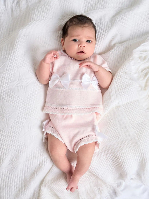 Sardon baby girl's knitted leg warmer set, includes a blush pink top with a white dot pattern, a pair of matching pink bottoms, and a cute knitted ...