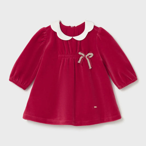 This elegant dress by Mayoral is crafted from a soft velvet fabric in cherry red. It has a white scalloped collar, and features a red and beige bow...