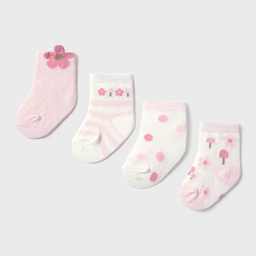 Mayoral baby girl's four pack of socks, in shades of white and pale pink, and featuring adorably cute floral designs. Code: 9921