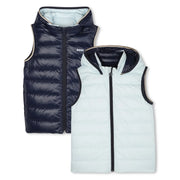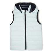 BOSS boy's reversible padded gilet. This versatile piece has a sky blue side with black trim, and a dark navy side with a sky blue BOSS logo on the chest. It also has a high collar, and a large hood, making it ideal for chilly autumn weather.
