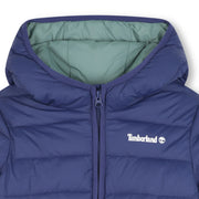 Timberland boy's warm padded jacket, in dark blue with a sage green inner lining, and a white Timberland logo on the chest. With elasticated hem and cuffs, and a large hood, it makes a great top layer on chilly days.