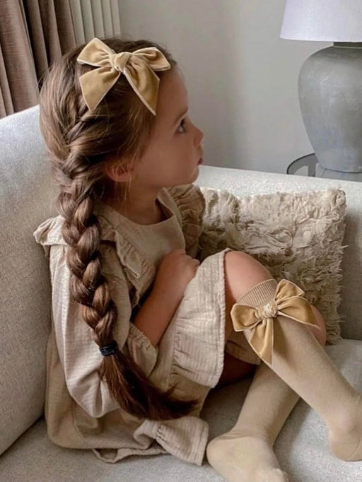 Girl's knitted neck warmer, in beige with a matching velvet bow on the side. Suitable for age 3 and up.  Code: 50429