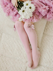 Girl's pink knee high socks by Condor, made from a soft and stretchy cotton, they are decorated with a pink ribbon bow at the cuff.