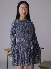Girl's elegant long sleeve dress by Mayoral, in navy blue with an all over pattern of small flowers. It has a simple rounded neckline and is finished with a matching printed sash around the waist.