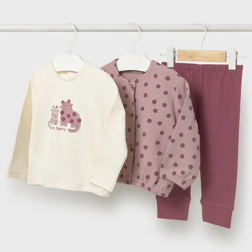 Baby girl's three piece set by Mayoral, includes a long sleeve t-shirt, a polka dot cardigan, and a pair of dark pink leggings. The cream white t-s...