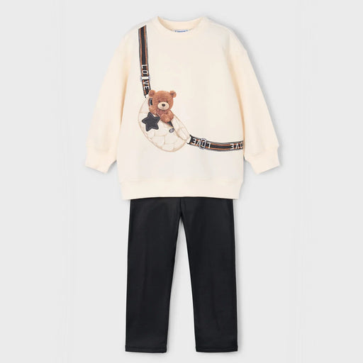Mayoral girl's two piece leggings set, includes a pair of plain black flared leggings, and a cream white sweatshirt with black stripes on the sleev...