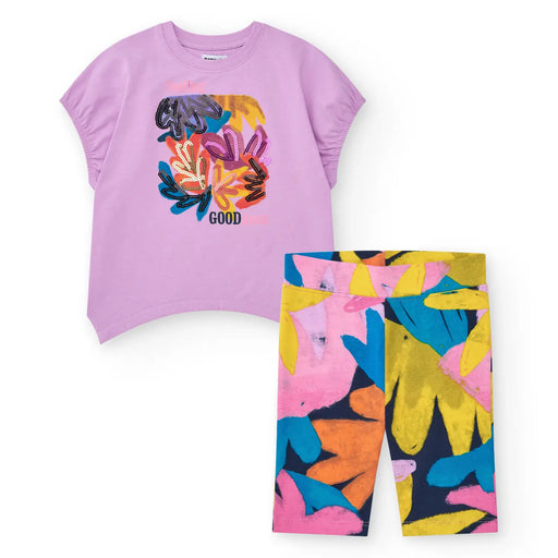 Girl's two piece t-shirt and skirt set from Boboli. This stylish outfit includes a charcoal black t-shirt with an abstract blob pattern in shades o...