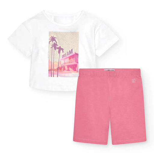 Girl's summer shorts set from Guess, includes a crisp white t-shirt, and a pair pale blue of printed shorts. The t-shirt features a pink embroidere...