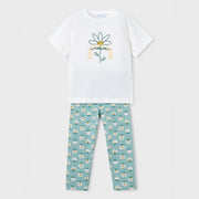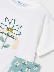 Mayoral girl's two piece summer leggings set, includes a pair of full length green leggings, and a white t-shirt. The leggings are patterned with yellow and white daisies while the t-shirt has an embroidered flower embellished with sparkly gold sequins.