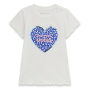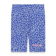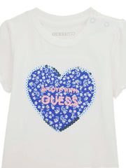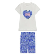 Baby girl's summer leggings set from Guess. Made for warm summer days, this two piece outfit includes a pair of bright blue capri leggings patterned with small white flowers, and a pure white t-shirt with a match blue floral print heart logo on the front.