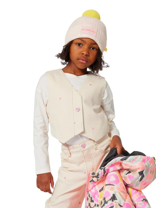 Baby girl's ivory white bobble hat, featuring an intarsia heart pattern in shades of black, orange, and burgundy, it also features a heart logo on ...