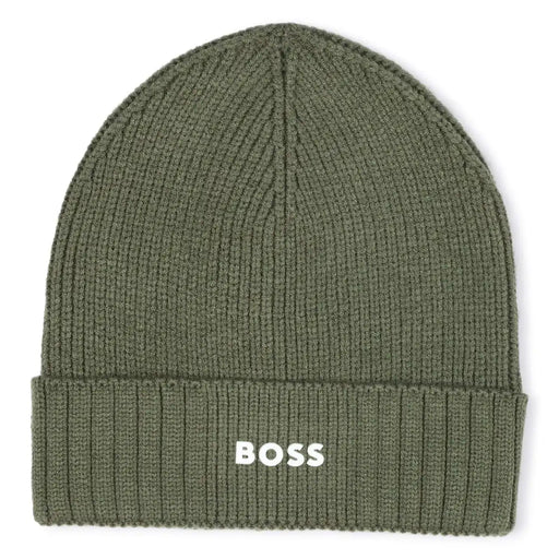 BOSS boy's beanie hat, in olive green with a white BOSS logo on the front. It features a double layer to help keep in the heat on chilly days. Co...