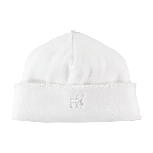 Newborn girl's hat by Deolinda, in ivory white with an elegant pattern of delicate pink flowers. It also has a small logo on badge on the front. C...
