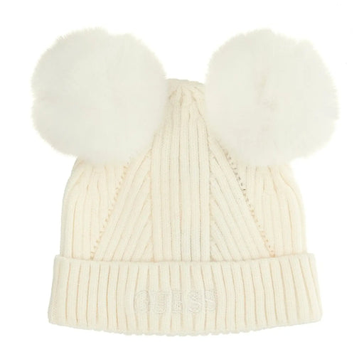Guess girl's cosy winter hat, in jet black with two large faux fur poms, and an embroidered Guess logo on the front. Code: j3bz04
