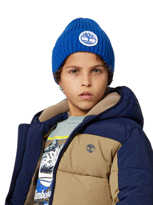 Boy's rib knit beanie, in tan brown with an embroidered BOSS logo on the front. Code: j52650