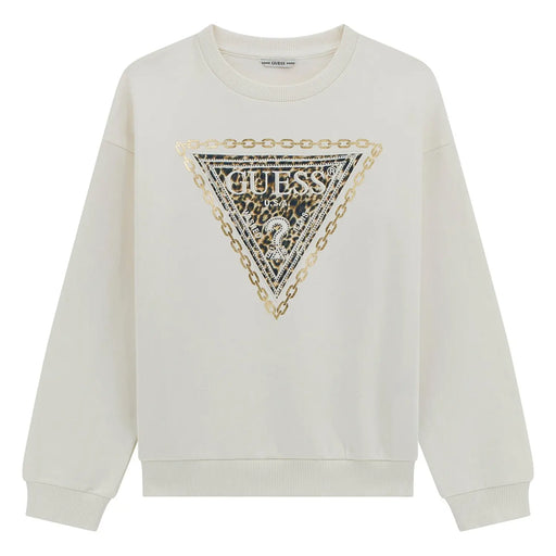 Guess girl's cream white sweatshirt, featuring drop shoulder sleeves, and a leopard print triangle logo on the chest, outlined with a double row of...