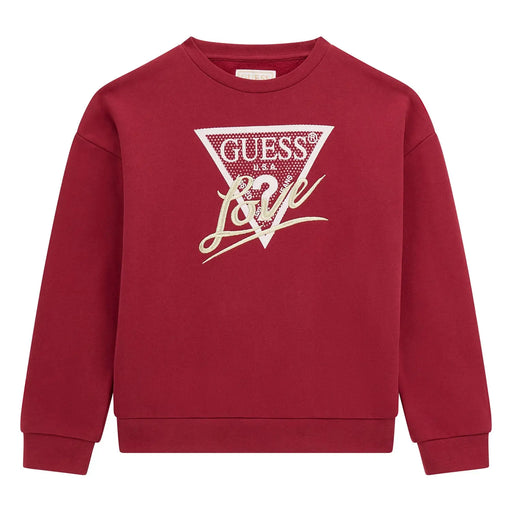 Guess girl's deep red sweatshirt, featuring drop shoulder sleeves, and a white triangle logo on the chest, overlaid with a gold embroidered 'Love' ...