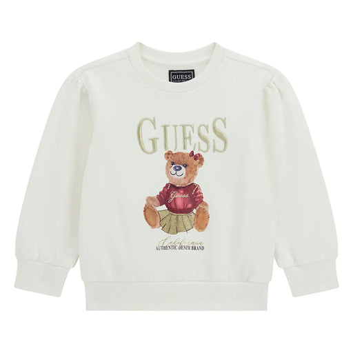 Girl's round neck sweatshirt from Guess, in cream white with a large silver rhinestone logo across the chest. Crafted from 100% cotton. Code: j5yq09