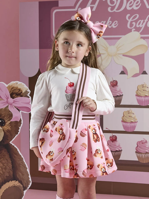 Guess girl's t-shirt and pinafore set, includes a denim pinafore, and a crisp white, lettuce hem t-shirt. The t-shirt has a navy printed bow collar...