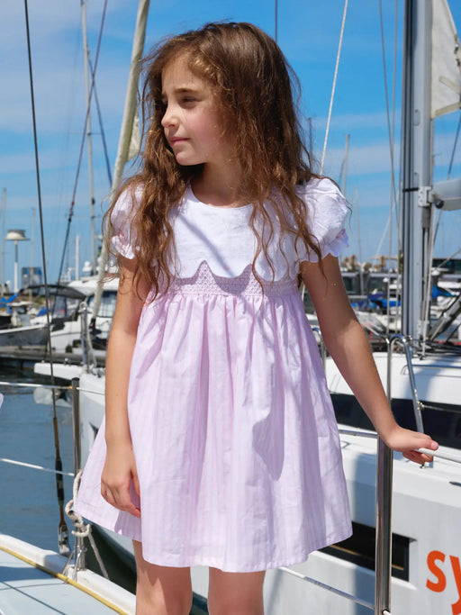 Baby girl's elegant summer dress by Deolinda. Featuring a pink and white striped skirt with smocking across the waist, it also has dainty puff slee...
