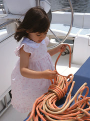 Made for special summer occasions, this elegant dress by Deolinda features an all over pink and white gingham pattern, overlaid with small pink bows. It has frilled trim at the shoulders and hem, and a white scalloped collar embroidered with two pink bows.