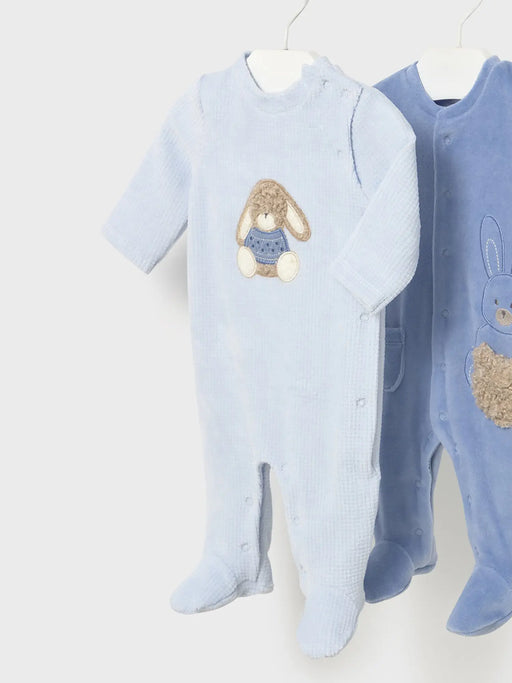 Mayoral newborn boy's two piece leg warmer set, includes a white sleeve top, and a pair of blue bottoms. The bottoms have a windowpane check patter...