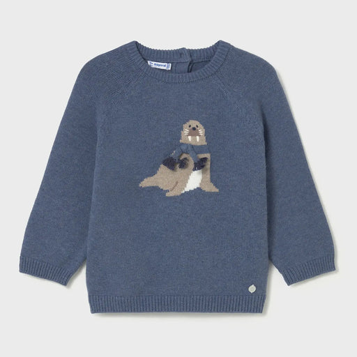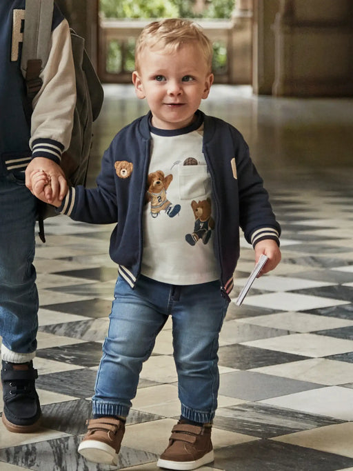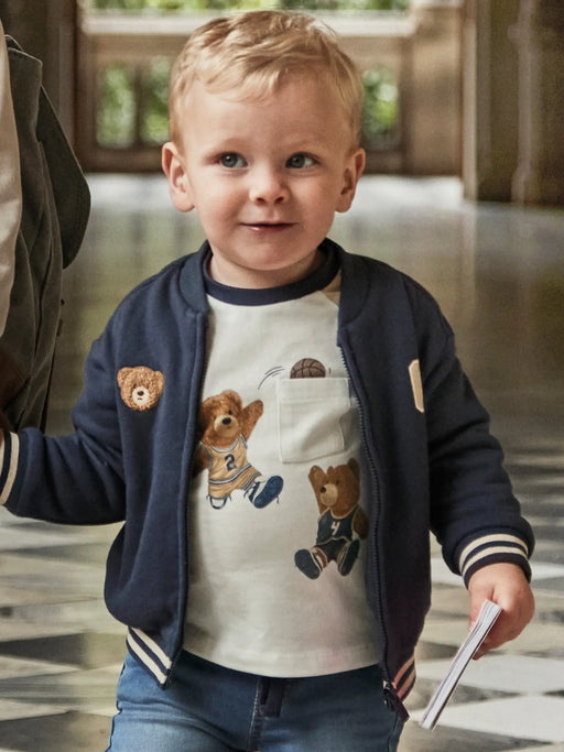 Baby boy's knitted jumper by Mayoral, in navy blue with a kangaroo pocket and an intarsia teddy bear on the front. It also has button fasteners on ...