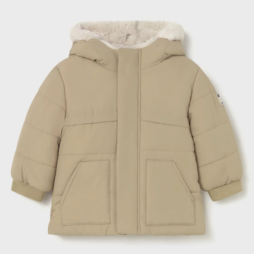 Mayoral baby girl's warm padded jacket, in light beige with a soft sheen finish. It also has a fleece inner lining, and faux fur trim around the ho...
