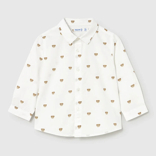 Mayoral baby girl's two piece shorts set, includes a cream long sleeve top with a large frilled collar and a print of a girl carrying a shopping ba...