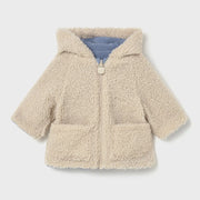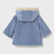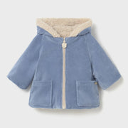 Newborn baby's reversible hooded jacket by Mayoral. Great for chilly autumn weather, this beautiful jacket has a beige shearling lining on one side, and an icy blue corduroy side with a small logo badge on the front pocket.