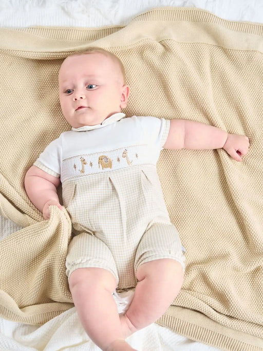 Mayoral newborn boy's dungarees style romper, in light beige with blue sleeves and an all over safari animal print featuring cute elephants, giraff...