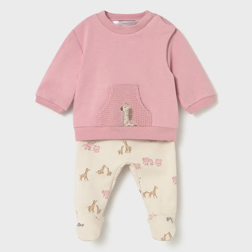 Deolinda newborn girl's babygrow, in pale pink with a white panel on the chest printed with cute flowers and woodland creatures. Code: 25124