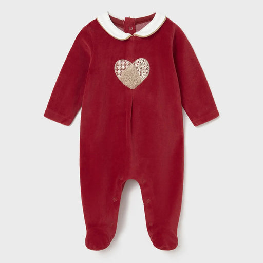 Newborn baby girl's babygrow from Deolinda. Made from a soft and stretchy velour cotton fabric, the bottom half is a deep red while the top half is...