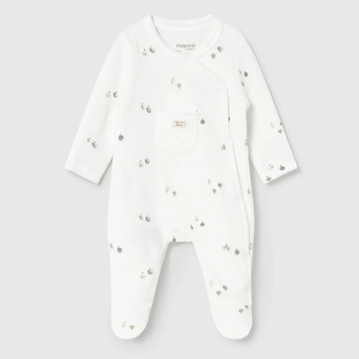 Mayoral newborn velour babygrow, in cream white with a pocket on the chest, and an all over pattern of grey and beige spots. Code: 2729
