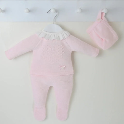 Sardon baby girl's knitted leg warmer set, includes a blush pink top with a white dot pattern, a pair of matching pink bottoms, and a cute knitted ...