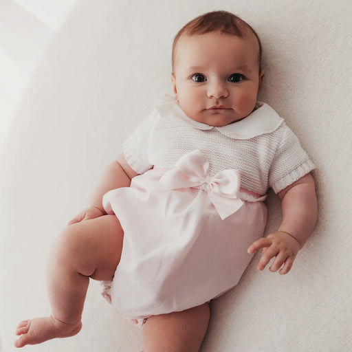 Tutto Piccolo newborn girl's pale pink babygrow. This charming piece has a cable knit pattern on the top section, along with dainty pink bows on th...