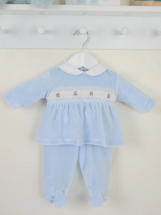 Mayoral newborn boy's sky blue babygrow, crafted from a textured velour fabric, it has a cute bunny appliqué on the front. Code: 2719