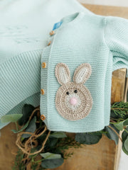 Sardon knitted romper and jacket set, includes a mint green romper with a white frilled collar, and a matching green jacket which features an adorable knitted bunny face on the front.