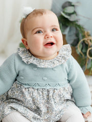 This adorable baby girl's dress from Sardon features a pale green knitted bodice, and a white skirt with an intricate floral print in shades of green and yellow. It also has a large frilled collar with a matching floral print.