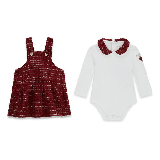 Baby's two piece romper set by Fofettes. This festive outfit includes a white with plaid trim on the collar, and a pair of white dungarees with a g...